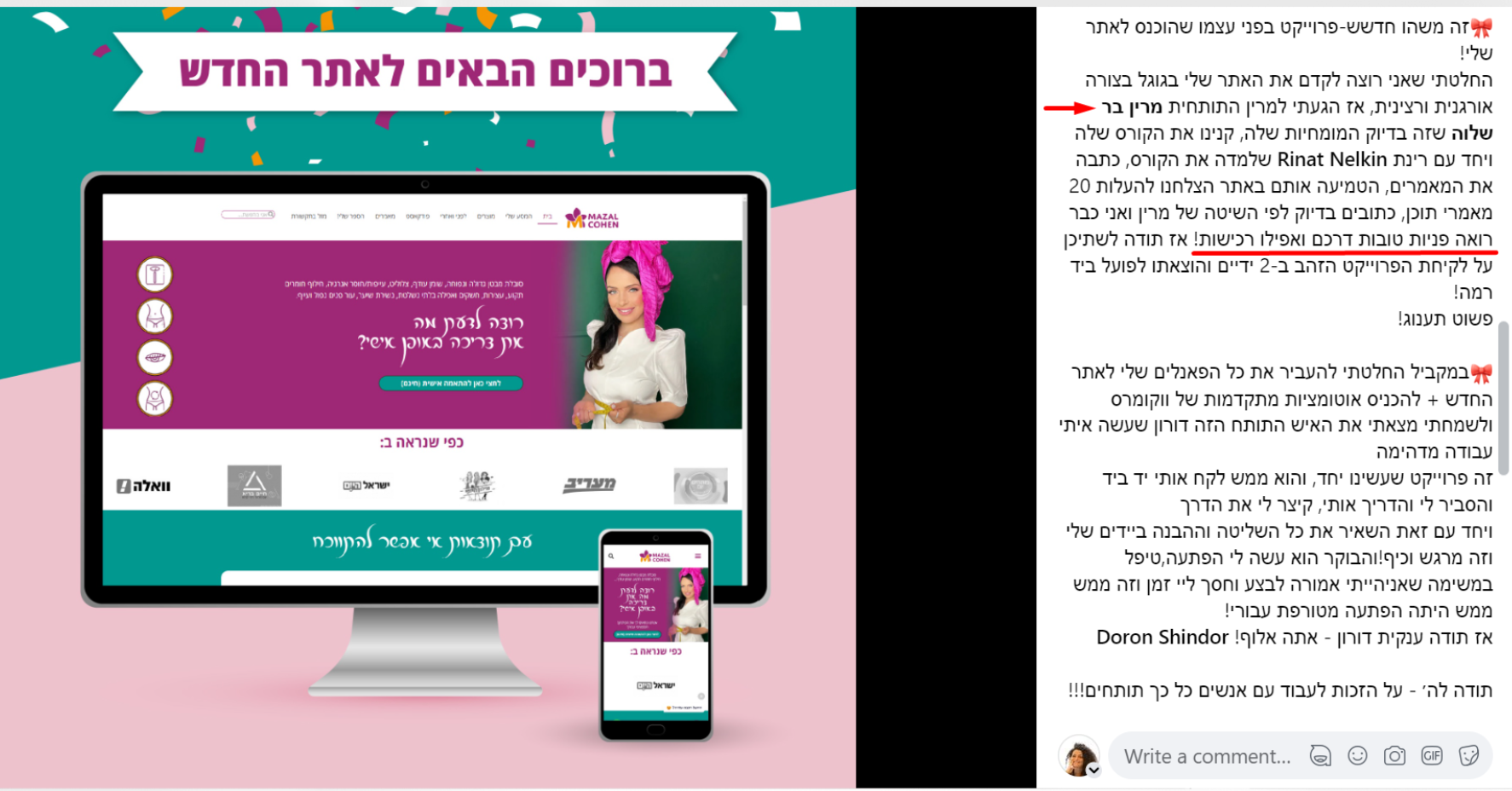 "החלטתי שאני רוצה לקדם את האתר שלי בגוגל בצורה אורגנית ורצינית, אז הגעתי למרין התותחית, שזה בדיוק המומחיות שלה, קנינו את הקורס שלה ויחד עם רינת שלמדה את הקורס, כתבה את המאמרים, הטמיעה אותם באתר הצלחנו להעלות 20 מאמרי תוכן, כתובים בדיוק לפי השיטה של מרין ואני כבר רואה פניות טובות דרכם ואפילו רכישות! " – מזל כהן